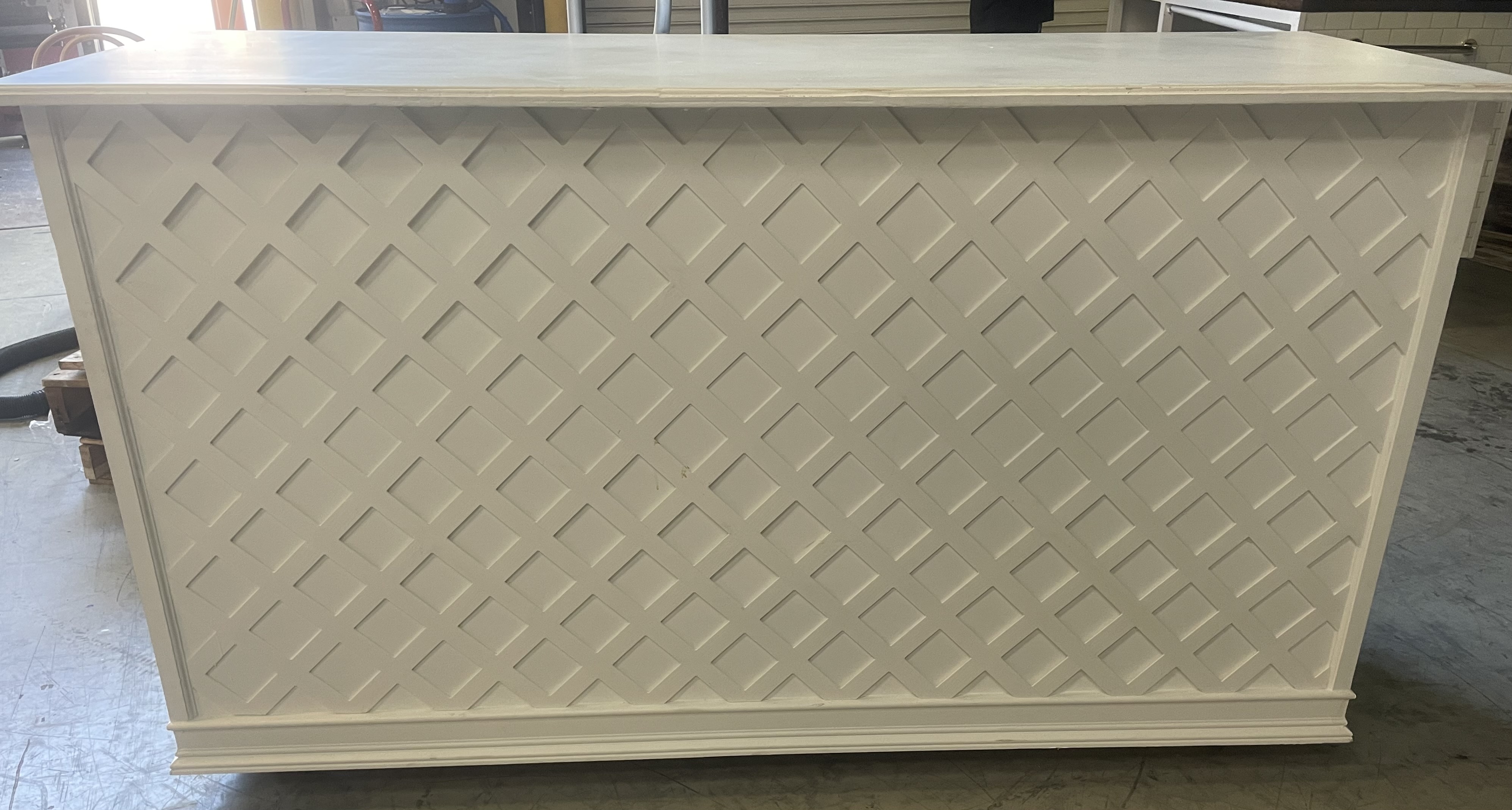 Collection Collection Bars + Furnishings Charleston Lattice Bar Search View Wishlist charleston lattice bar Description: Our white garden bar with a removable lattice piece Quantity: 2 Dimensions: 72 x 44 x 23 Add to Wishlist