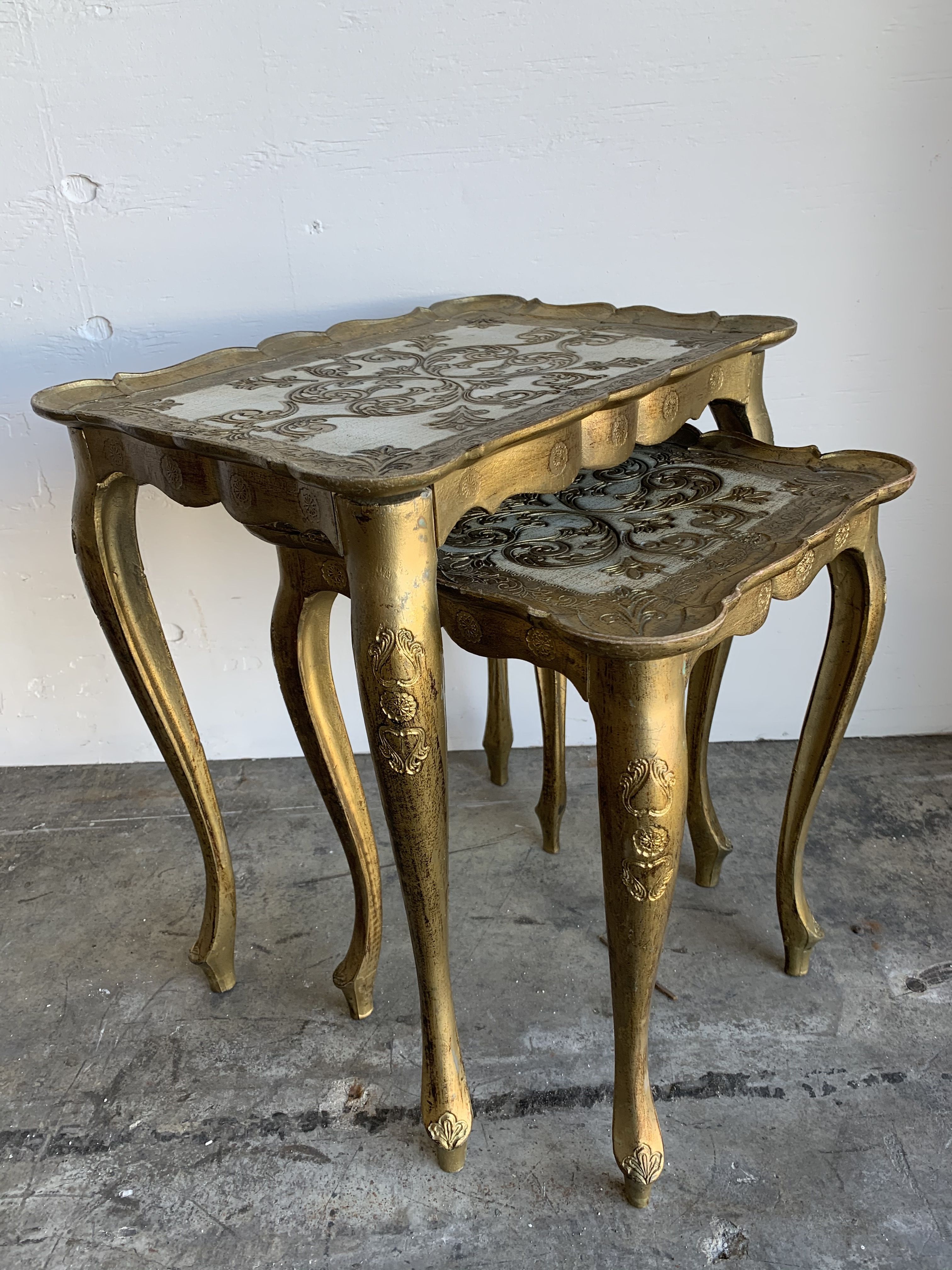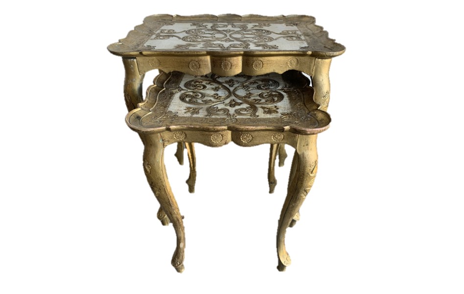 Collection Collection Coffee + Side Tables Cooper Nesting Tables Search View Wishlist cooper nesting tables Description: set of 2 florentine gold nesting tables with ornate ivory detais. Quantity: 1 Dimensions: 21 x 13 x 22 Tags: gold, ivory, lounge furniture, table, princeton Add to Wishlist