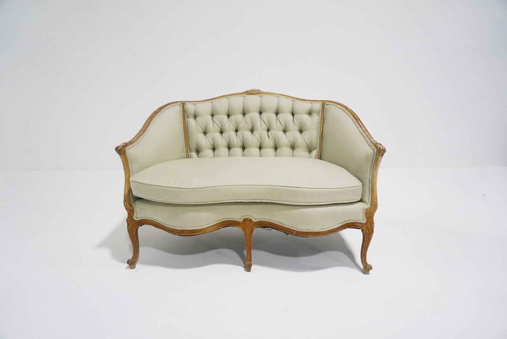 Collection Collection Upholstered Seating Emery Settee Search View Wishlist emery settee Description: light sage green french tufted settee. comfortably seats 2. the perfect addition to any lounge or sweetheart table. Quantity: 1 Dimensions: 52 x 34 x 28 Add to Wishlist