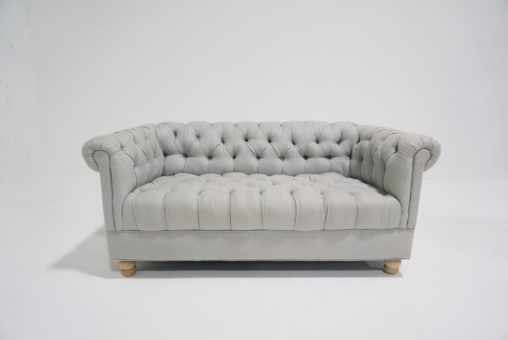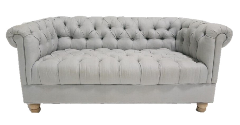 Collection Collection Upholstered Seating Evelyn Sofa Search View Wishlist evelyn sofa Description: grey linen tufted chesterfield sofa. seats 3. Quantity: 1 Dimensions: 64 x 31 x 27 Tags: lounge furniture, sofa, couch, tufted, chesterfield, lounge Add to Wishlist
