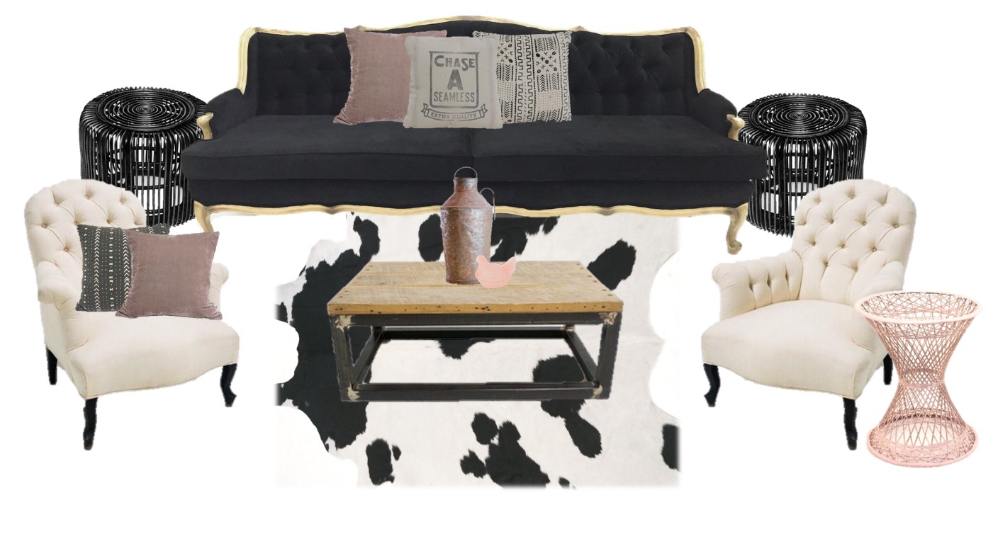Collection Collection Styled Lounges Galveston Lounge Search View Wishlist galveston lounge Quantity: 1 Add to Wishlist Kit Contains bowery chair moni side table (black) brinkmann sofa pink wicker base caldwell coffee table pink hen farmhouse milk jug set of 3 pillows black mud cloth pillow white mud cloth pillow #4 grain sack pillow #4 dusty blush velvet pillow