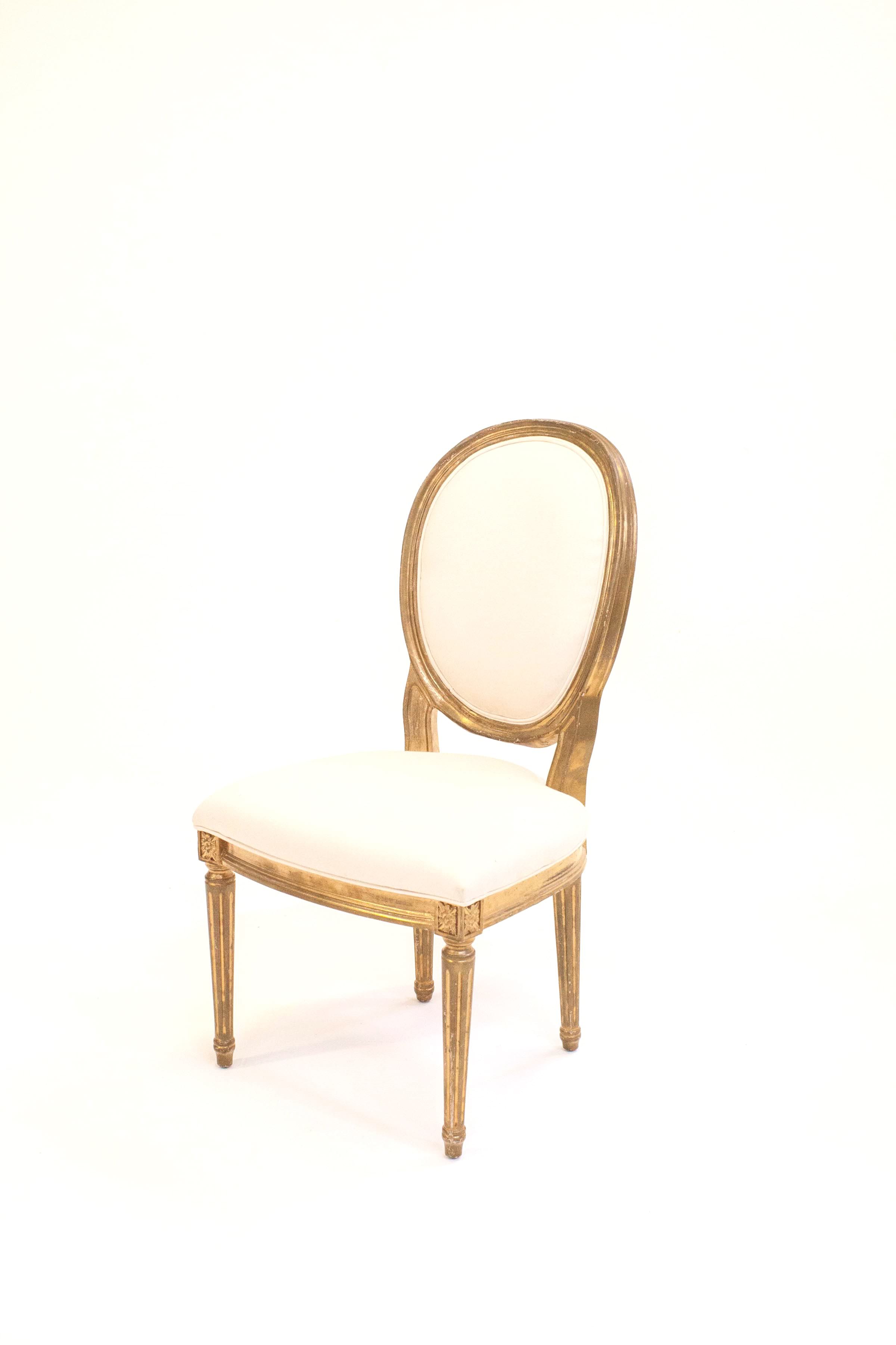 louis style side chairs with gold painted framework and ivory linen upholstery. the perfect addition to any sweetheart table.