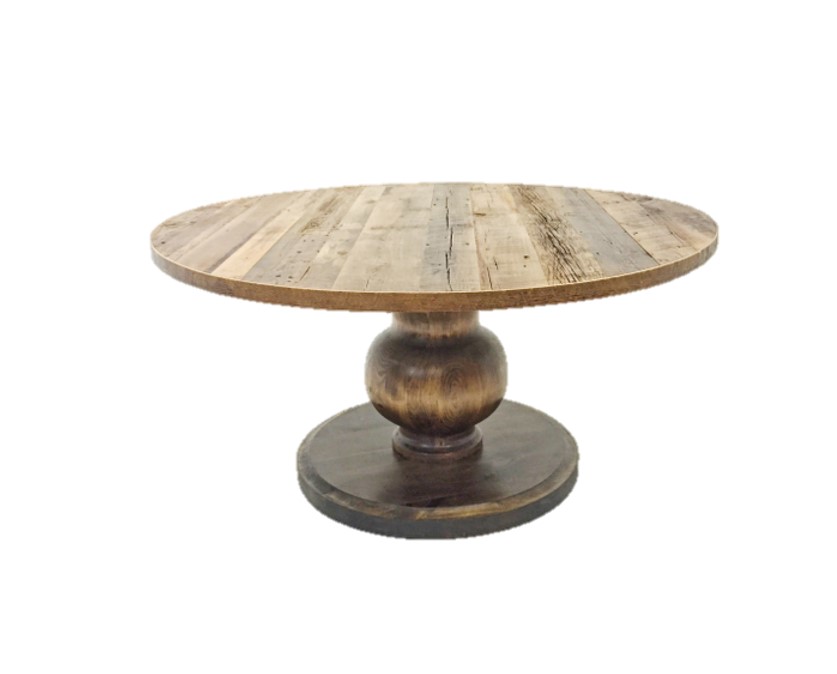 Collection Collection Dining + Cocktail Tables Kingston Round Search View Wishlist kingston round Description: wooden round table with a reclaimed barnwood top and a hand turned solid wood base. seats 8 guests. Quantity: 20 Dimensions: 60 x 60 x 30 Add to Wishlist
