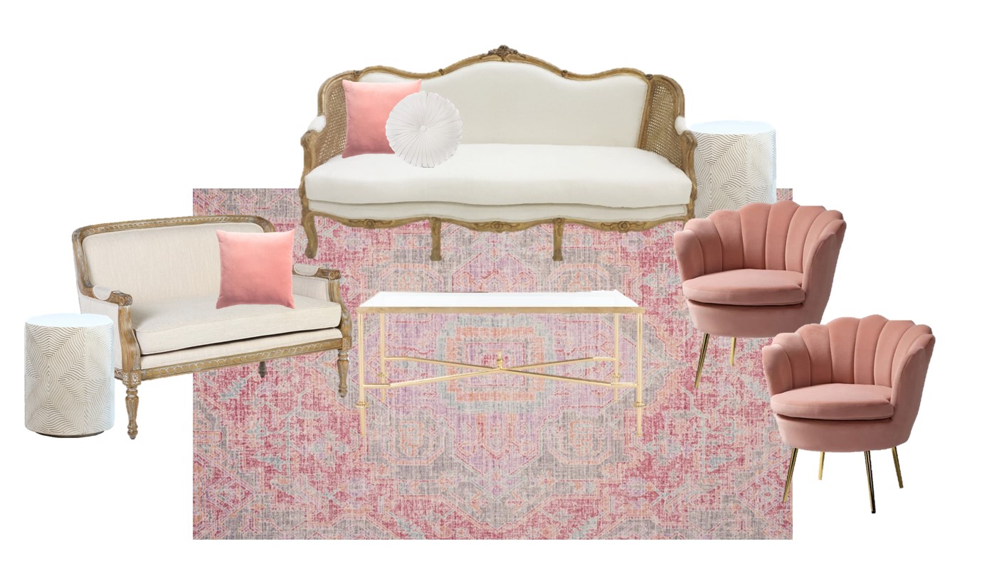 Collection Collection Styled Lounges Landry Lounge Search View Wishlist landry lounge Add to Wishlist Kit Contains hazel sofa enid side table whitney chair (blush) devi coffee table payson sofa round white velvet pillow set of 3 pillows blush velvet pillow