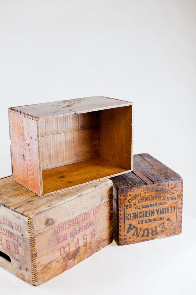 large vintage wooden crates. perfect to give added height to a dessert display or escort card table. rented individually.