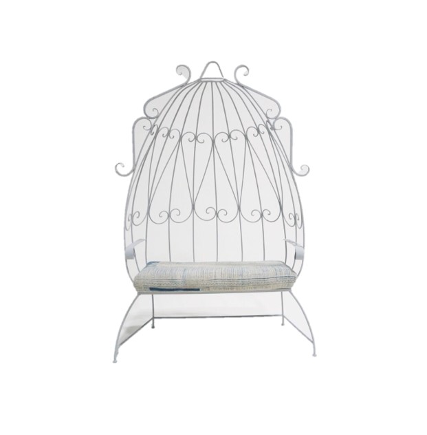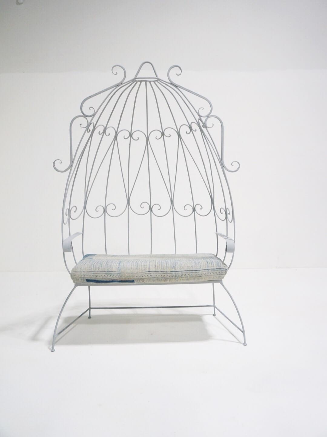 whimsical light grey metal frame garden bench with vintage india batik fabric cushion. perfect for accent piece or paired with our sweetheart tables. seats 2.