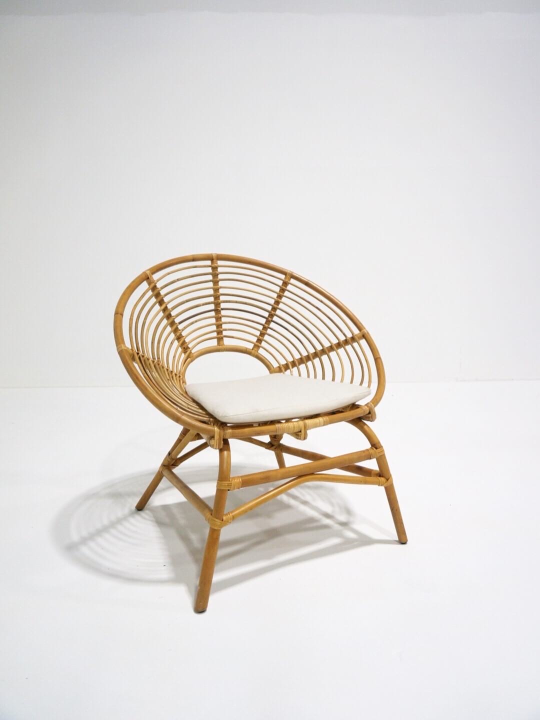 made entirely of sustainable rattan, the ring chair is a modern reinterpretation of a classic 1960's french design. this contemporary chair marries traditional weaving technique with a modern silhouette. each piece is made of natural materials, strips of rattan are hand-woven around pole rattan to create a piece that is both sculptural and comfortable.