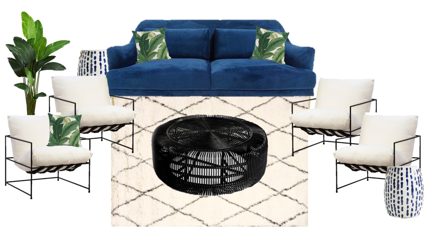Collection Collection Styled Lounges Nicholls Lounge Search View Wishlist nicholls lounge Description: modern tropics coming right up in this grouping with seating for 7 guest Add to Wishlist Kit Contains reeves chair colony side table faux travelers palm landis sofa haven rug palm leaf pillow #2 set of 3 pillows