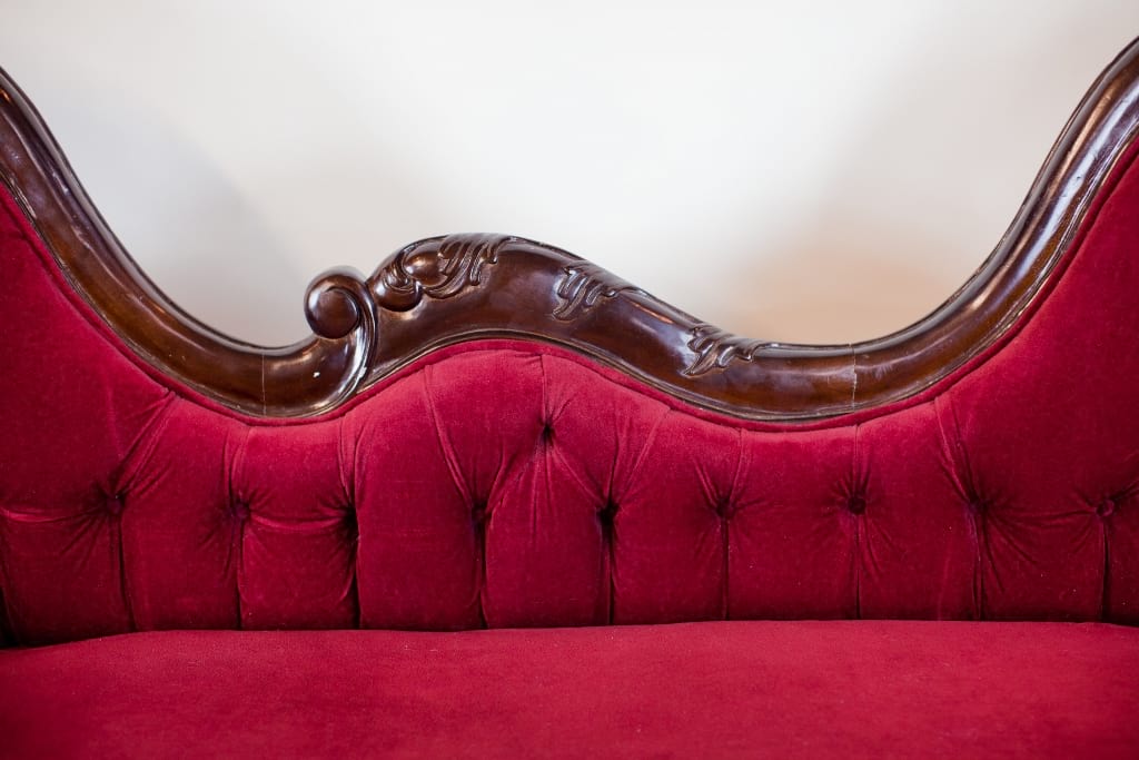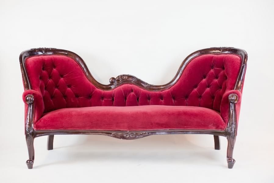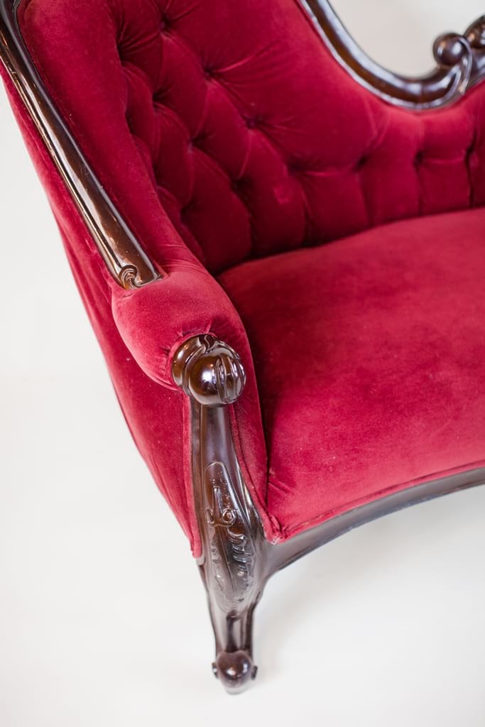 Collection Collection Upholstered Seating Ruby Sofa Search View Wishlist ruby sofa Description: red velvet tufted victorian sofa with dark wooden frame. seats 3. Quantity: 1 Dimensions: 73 x 24 x 36 Tags: red, lounge furniture, victorian, sofa, couch, tufted, velvet, love seat, lounge, princeton Add to Wishlist