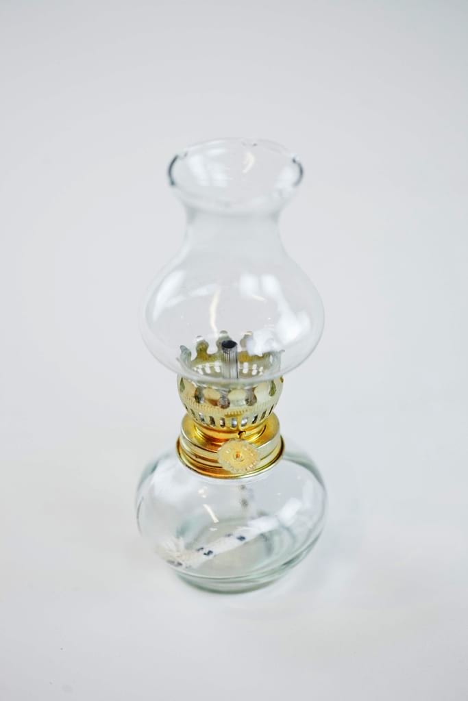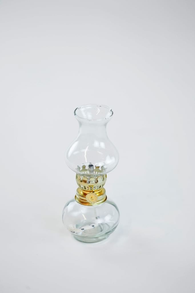 small glass oil lamp with gold details. great way to add some ambient light to a table with a contained flame.