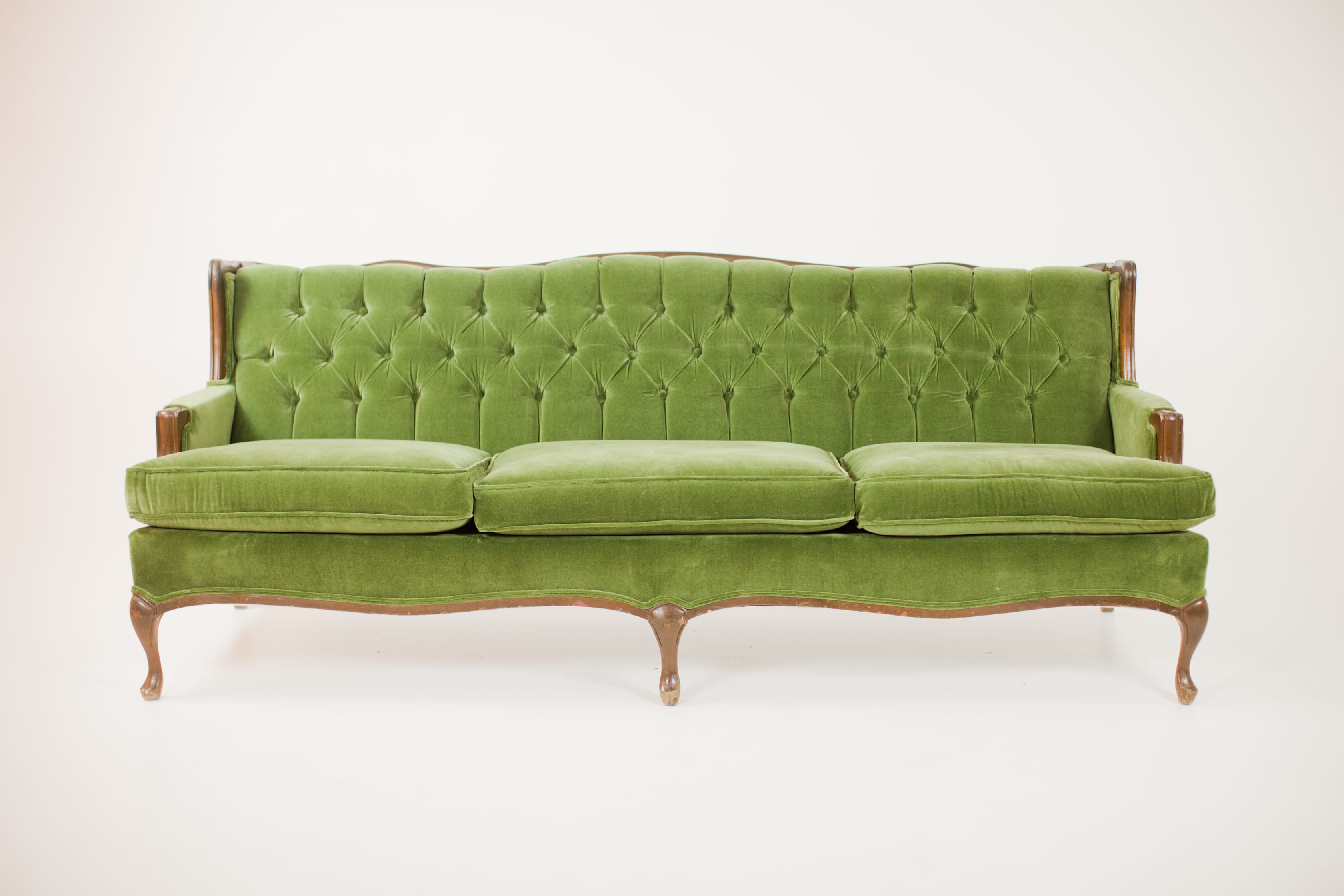 Collection Collection Upholstered Seating Vera Sofa Search View Wishlist vera sofa Description: olive green velvet tufted sofa with dark wood details. seats 3-4. Quantity: 1 Dimensions: 77 x 30 x 30 Tags: green, lounge furniture, sofa, tufted, velvet, lounge Add to Wishlist